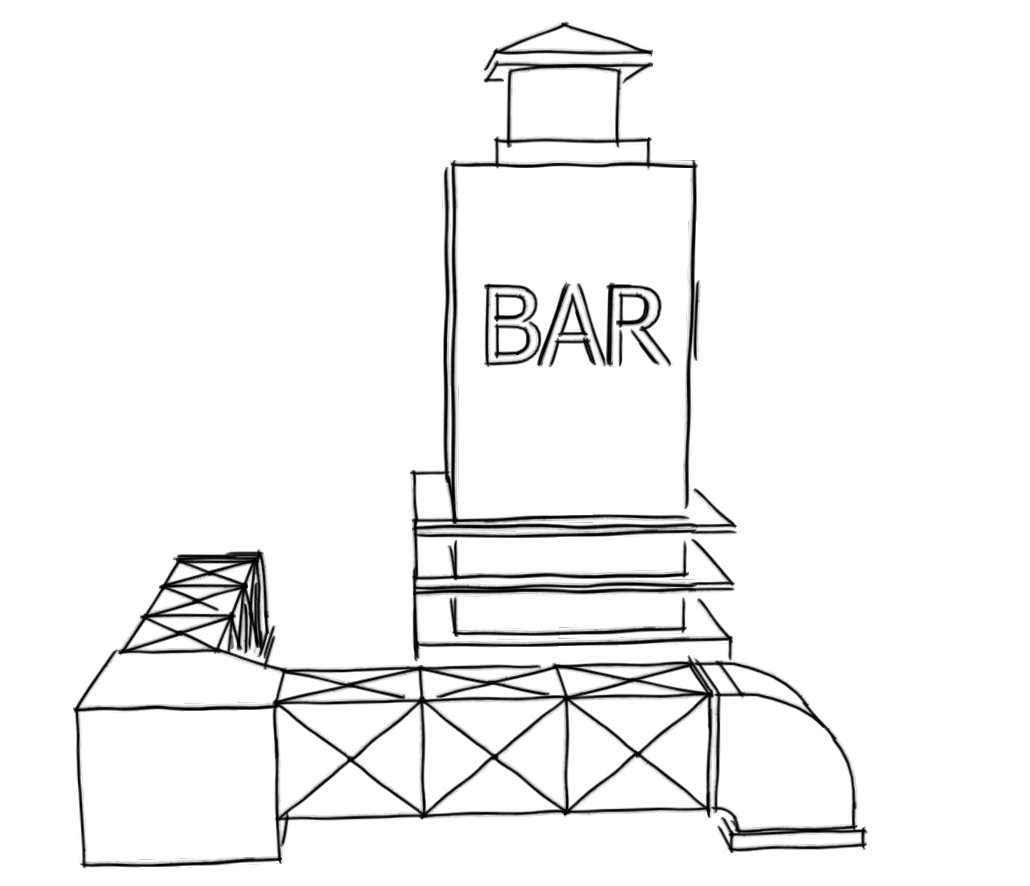 Case Study: Client says, “I want an exhibit hall to feel like you’re on a rooftop bar. What can you do?” We proposed a statement bar that was the central focus in the room. The bar back? A chimney. The counters? How about some HVAC ducts. Here are the initial “doodles.”